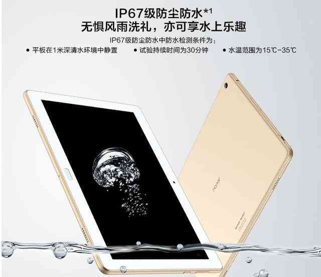 荣耀Water play防水平板电脑是一款新产品,它支持IP67高级别防尘防水,可能这么说大家并没有什么概念,说白了就是,荣耀Water play可实现在深达一米,水温不超过35℃的清水环境中静置30分钟的时间。这样的话,就算不慎掉到了水里,只需拿起来擦干它,便可接着使用了。荣耀Water play作为一款高性能平板,它搭载麒麟八核芯片,最高配备4GB运存,采用10.1英寸超大屏幕,看什么都畅快。此外,荣耀Water play还内置了6660mAh大电池,让你看片可以看上更久。
