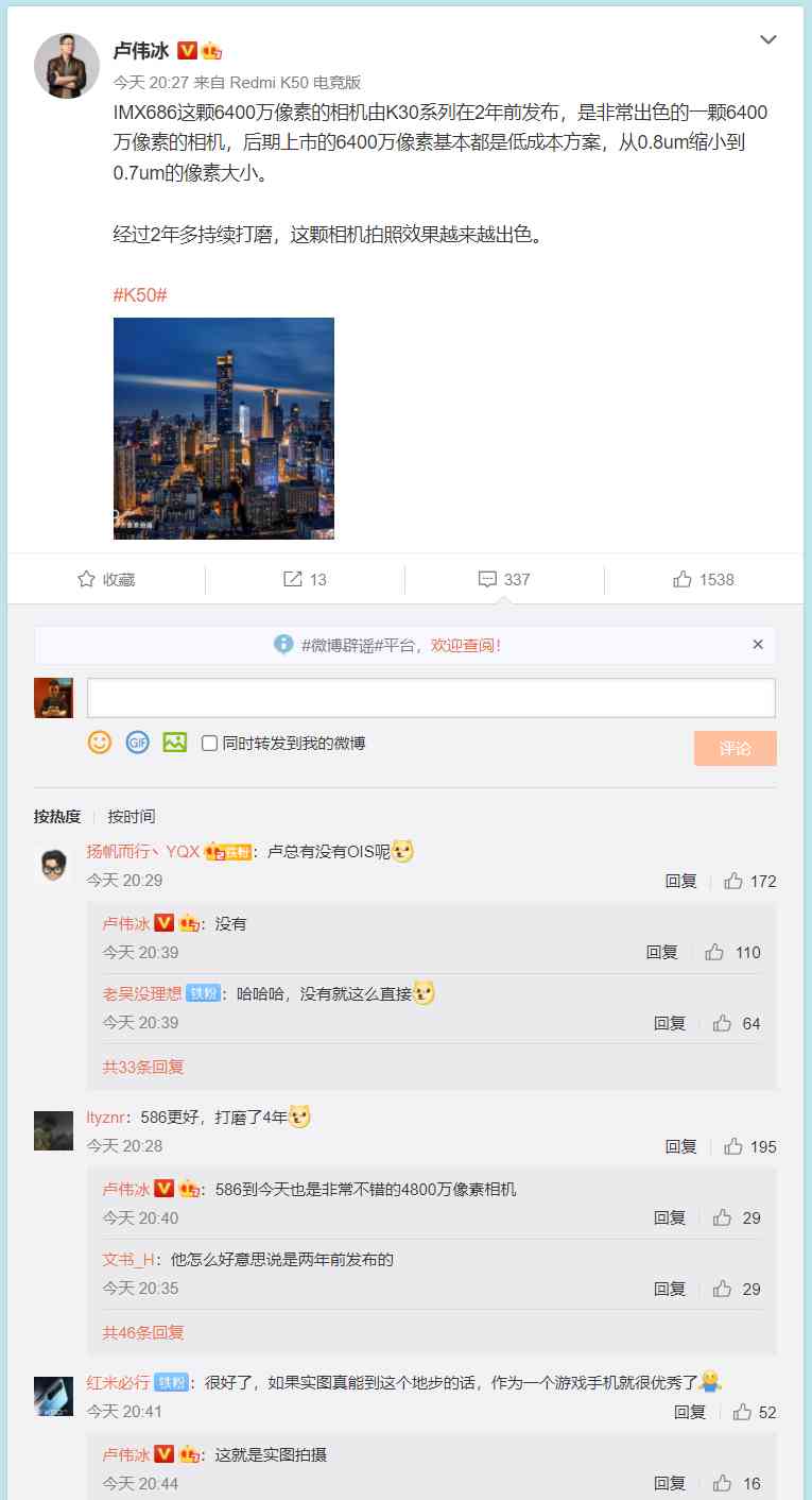 今天,官方预热了Redmi K50电竞版的相机,其主摄采用的是6400万的IMX 686主摄,而熟悉手机的网友都知道,IMX 686曾经是旗舰机的御用主摄,其拍摄的性能很不错。对此,卢伟冰表示:经过2年多的打磨,这颗相机的拍摄越来越出色,而网友则认为很好,作为一个游戏手机很优秀。