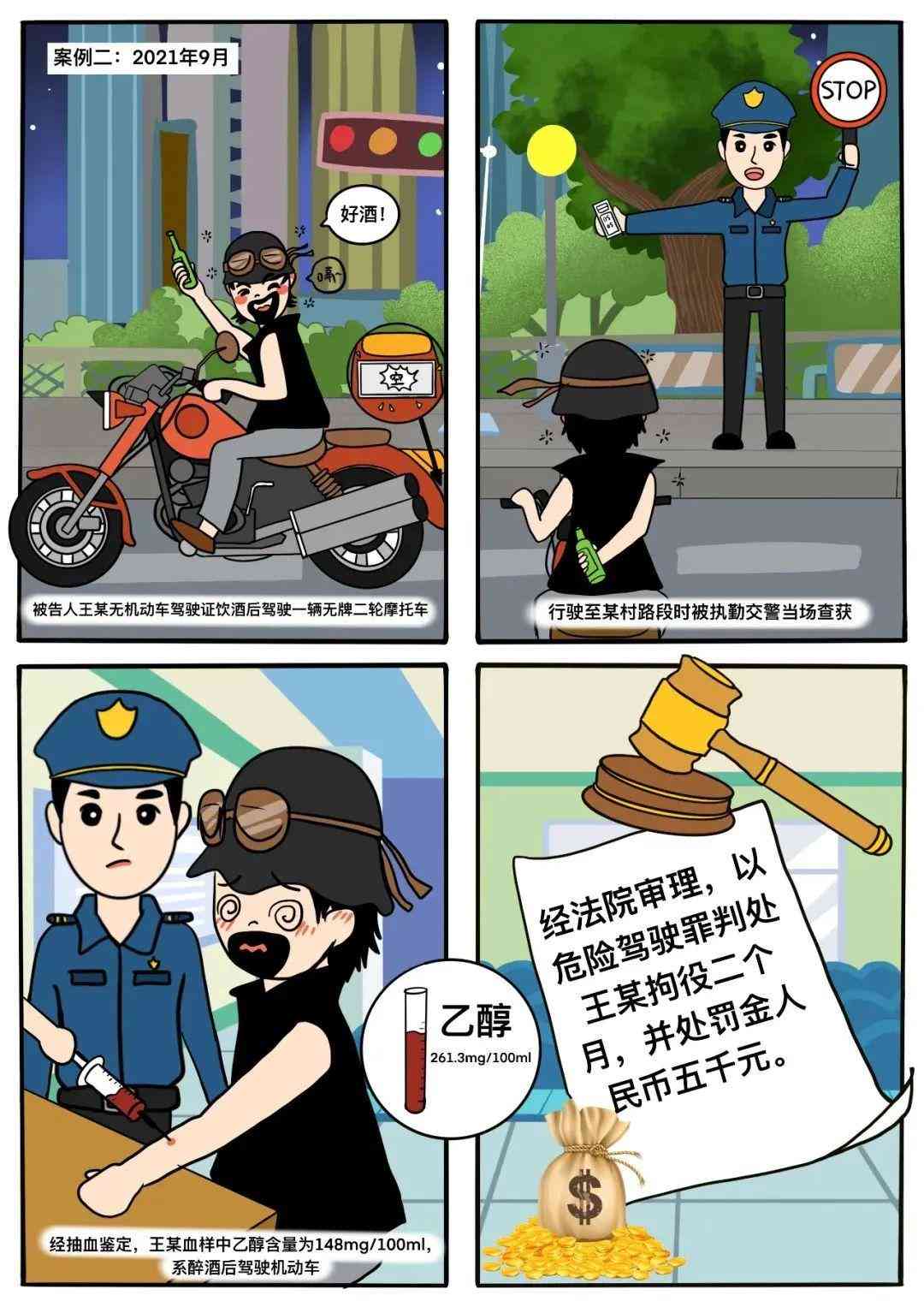 2021年9月,被告人王某无机动车驾驶证饮酒后驾驶一辆无牌二轮摩托车,行驶至某村路段时被执勤交警当场查获。经抽血鉴定,王某血样中乙醇含量为148mg/100ml,系醉酒后驾驶机动车。法院经审理以危险驾驶罪判处王某拘役二个月,并处罚金人民币五千元。
