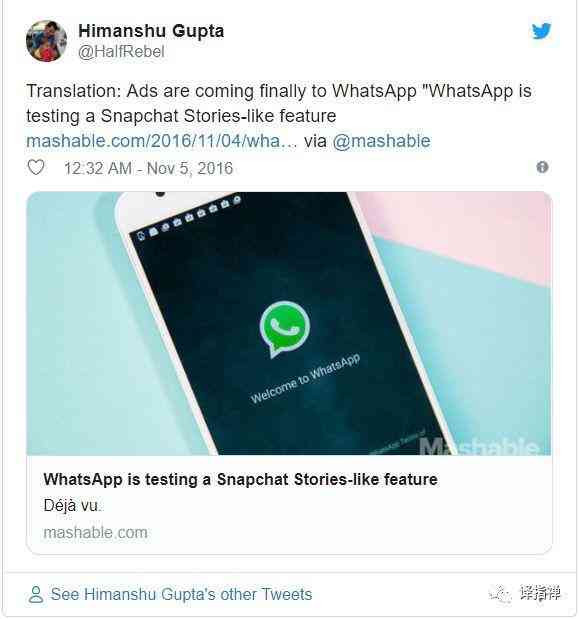 WhatsApp是一个月度活跃用户超过十亿却尚未开始变现的信息流应用。2016年11月,WABetaInfo 网站报道了WhatsApp测试版发布的新功能,据称WhatsApp将推出类似于Snapchat Stories的功能,我当时就觉得这个有趣的功能有助于WhatsApp的广告变现,而这一预测在2018年8月成为现实,具体可以在我的Facebook和Twitter上看到。