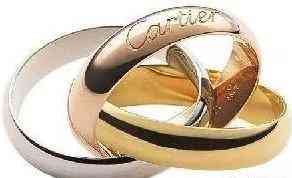 1.三环:路易.卡地亚的挚友,法国文人Jean Cocteau在一次巴黎的晚会上向卡地亚透露了自己对于首饰的美好向往。因此,卡地亚特别为其设计了一款别具心思的饰品:由三种颜色的金组成的一款卡地亚戒指,三环交织的经典形象就这样诞生于一位诗人与一位珠宝巨匠的交谈中。三种颜色的金分别代表着不同的含义:白金代表友谊,黄金代表忠诚,玫瑰金代表爱情。而此三环的设计也应用在手表、钢笔、打火机等其他配件上。