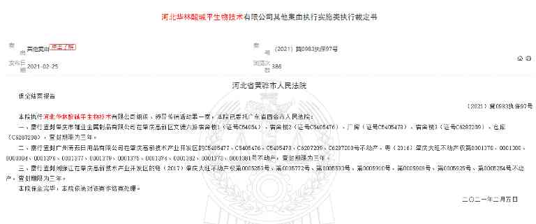 根据中国裁判文书网,2021年2月5日,河北省黄骅市人民法院执行河北华林酸碱平生物技术有限公司组织、领导传销活动罪一案,委托广东省四会市人民法院需行查封广州清茹日用品有限公司在肇庆高新技术产业开发区的多项不动产,查封期限为三年。