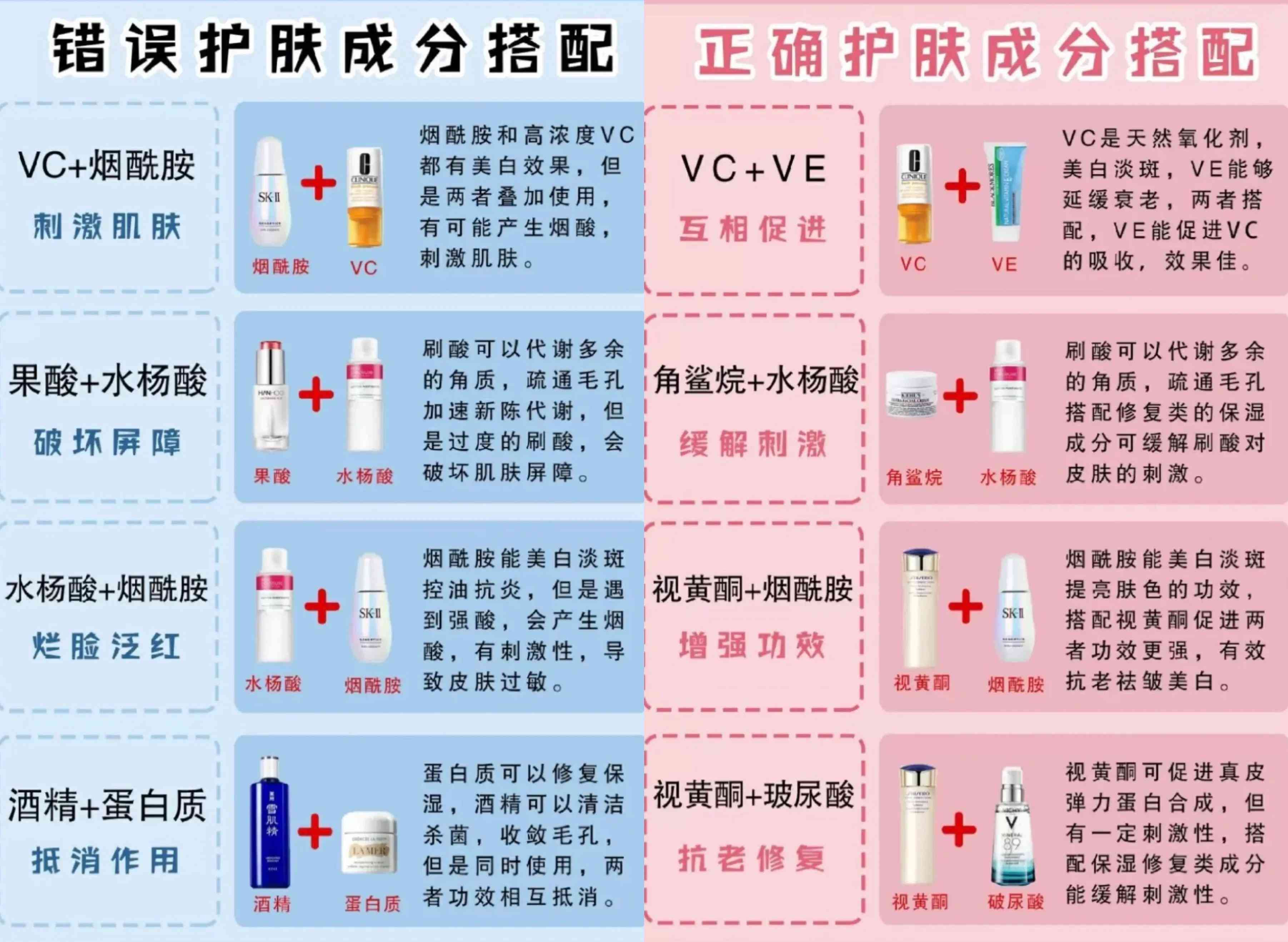 所以我们混搭护肤品时也可以使用基础保湿的产品与具有功效性的产品混搭,这样的搭配组合不容易踩雷,像补水+提亮、抗老+补水等。或者进阶混搭,可以选择两种功效型的成分组合,那么这也更考验你对成分的了解,不懂的小姐妹可以看下图避免。