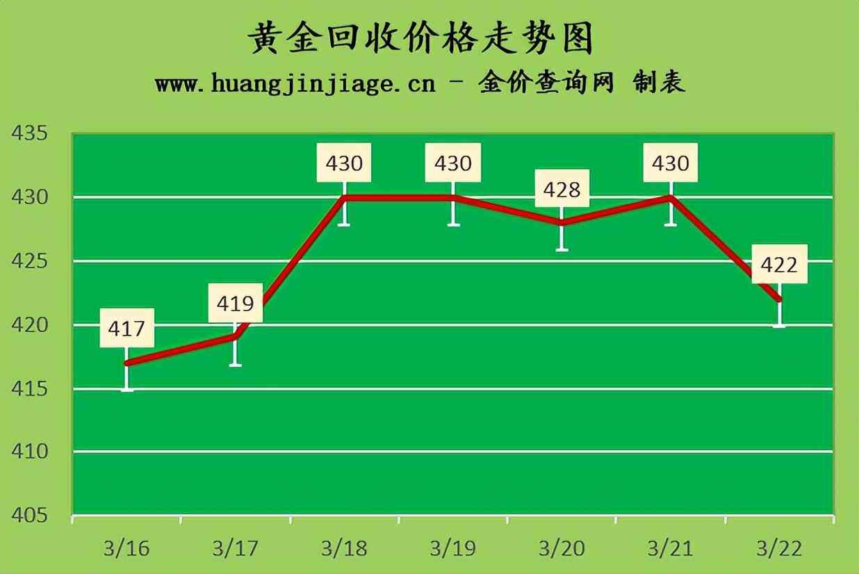 黄金回收价格422元/克,铂金回收价格187元/克,钯金回收价格285元/克,18K金回收价格309元/克,银条回收价格3.6元/克。(黄金行情是波动的,回收金价没有固定标准。)