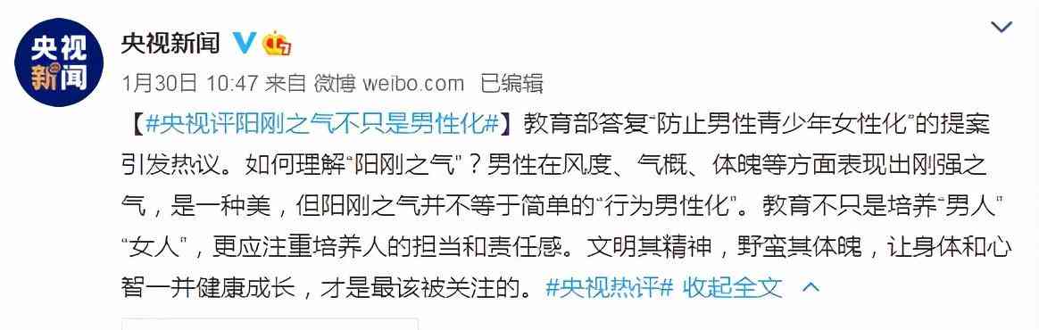 央视新闻也评论:教育不只是培养“男人”“女人”。