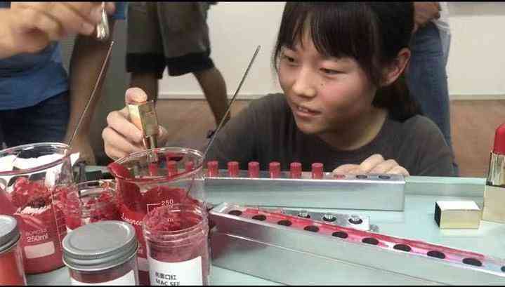 只见技术经理将加热融化后的口红膏体倒进制作模具的一个个管状小洞里,等待它们凝固成形,再娴熟地将一只只口红膏体插进金属管里。接着是制作眼影,他把同学们选中的眼影粉舀到特定铁盒中,抹平表面,再放进专门的压片机中印上浙大校标……