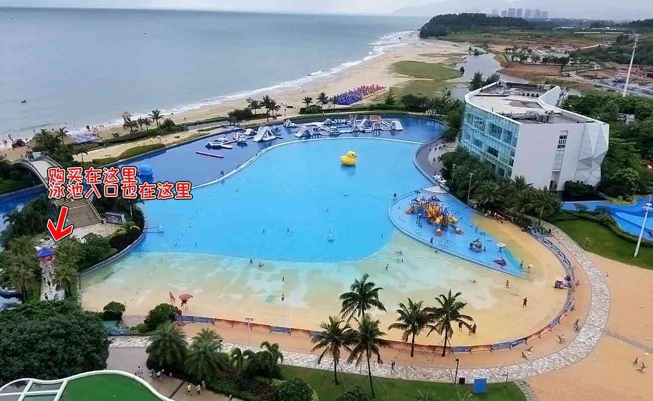 免费沙滩有快艇、高空飞伞、水上摩托等项目都要另外收费的;进游泳池没有地方换衣服,也没有保险箱记存东西;游泳池的门票还可以去1栋1楼前台购买,价格便一点点;(图)这个充气游泳池是另外消费的,一小时25元,只能小孩进去,成年人门口看;