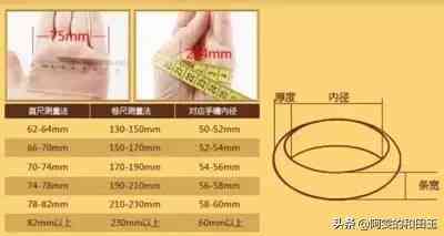 手镯的圈口内径一般是50mm到64mm,可参照手镯圈口测量表,这个只是一个初步的判断尺寸,还要根据实际的手硬程度及镯型来确定最终的圈号。手偏硬对应的圈号就要调大1到2号;圆条手镯就要比正装镯型的受力面积小,挑选圆条手镯时就可以小1到2号。所以在挑选手镯时,如果是网上挑选,就要和商家多沟通,老练的商家身高体重也是一个参考的数值,来判断你的圈号,最终挑选出你合适的圈号。