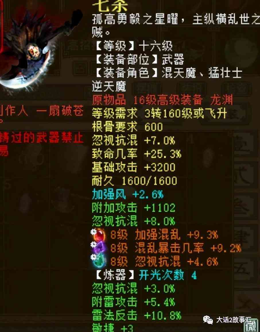 武器是十六级装备,底子是忽视抗混加7,炼化效果忽视抗混加8,炼器是忽视抗混加3,敏捷加3,这样的武器属性虽然很不错,但是并不昂贵。宝石就非常优秀了,三颗八级宝石,加强混乱9.3,忽视抗混4.6.