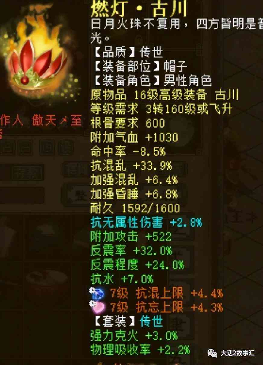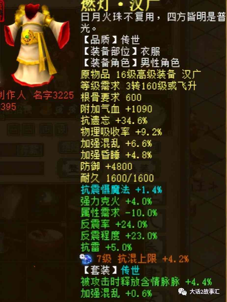 燃灯的衣服底子是抗遗忘34.6,抗物理9.2,加强混乱6.6,炼化效果属性需求-10%,反震率24,反震程度23,套装绿字加强混乱0.6,细节到位。