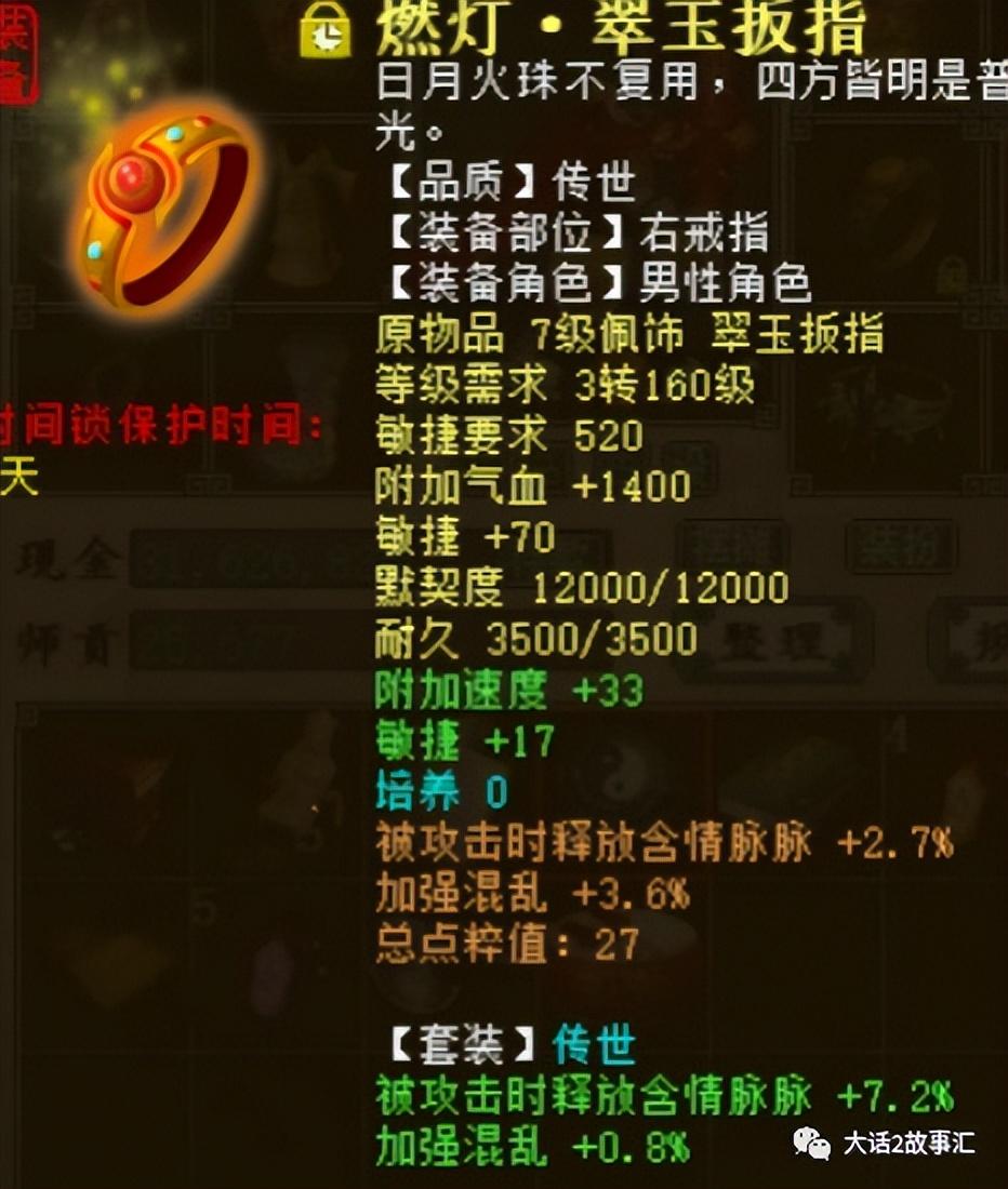 两个戒指的点粹属性也是非常给力加强混乱加3.6,并且都带被攻击时释放含情脉脉属性,套装绿字加强混乱0.8.