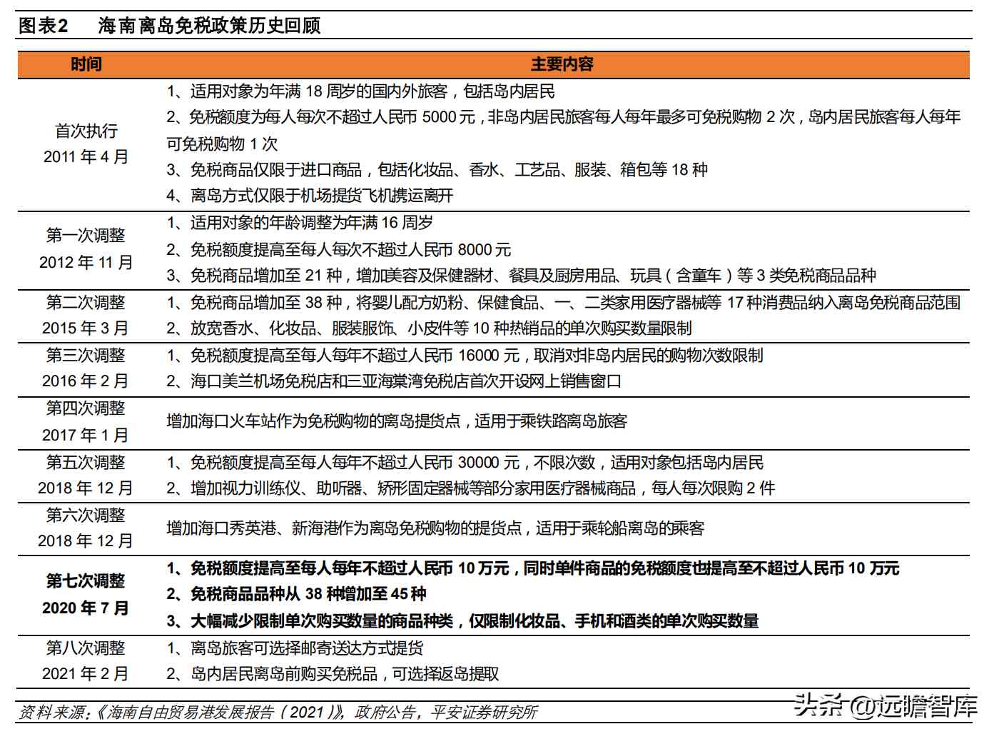 2011 年,关于开展海南离岛旅客免税购物政策试点》事项,海南离岛免税政策开始试行,并分别在 2012年、2015年、2016年、2017年、2018年、2020年、2021年进行八次调整,免税商品范围和免税购买件数、免税额度、单品免税额度不断提高,购物方式、提货方式更加便利化。