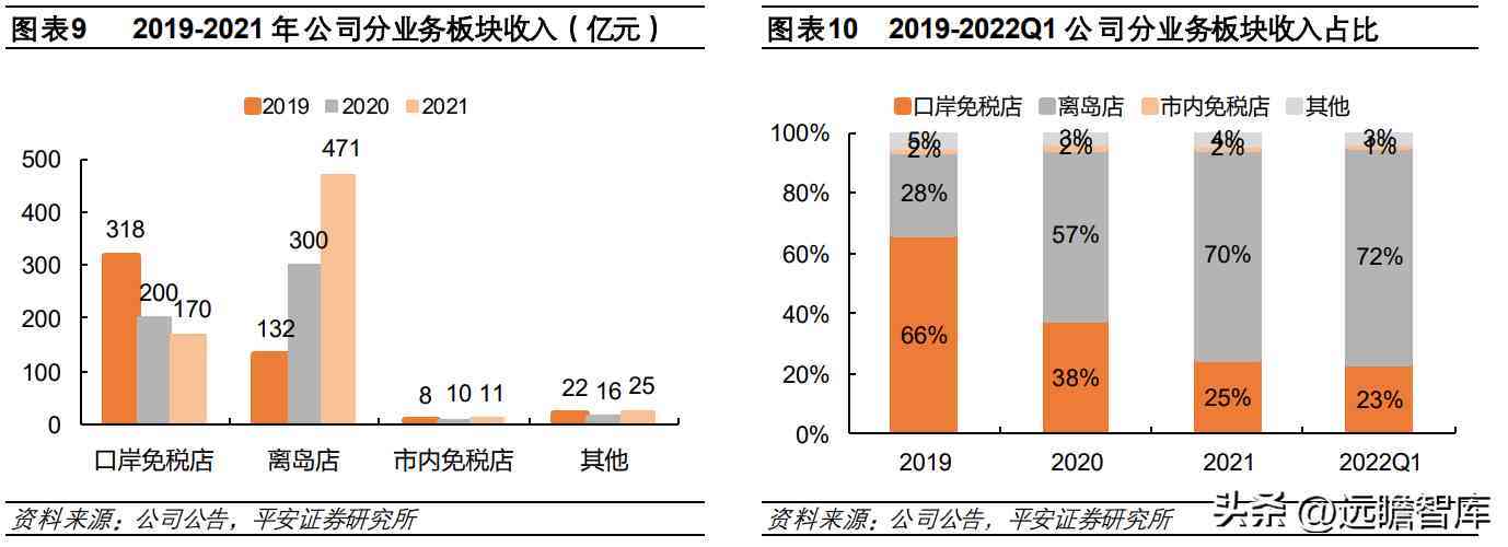 公司业务板块分为口岸免税、离岛免税、市内免税及其他,2021年收入占比分别为25%、70%、2%、4%。