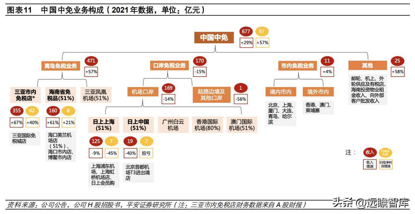 财报口径看,子公司三亚市内免税店 2019-2021 年收入 104.6 亿元、213.2 亿元、355.1亿元,净利润 14.2亿元、29.7亿元、41.7亿元,收入、净利润 2019-2021年复合增长率分别为 84%、71%。