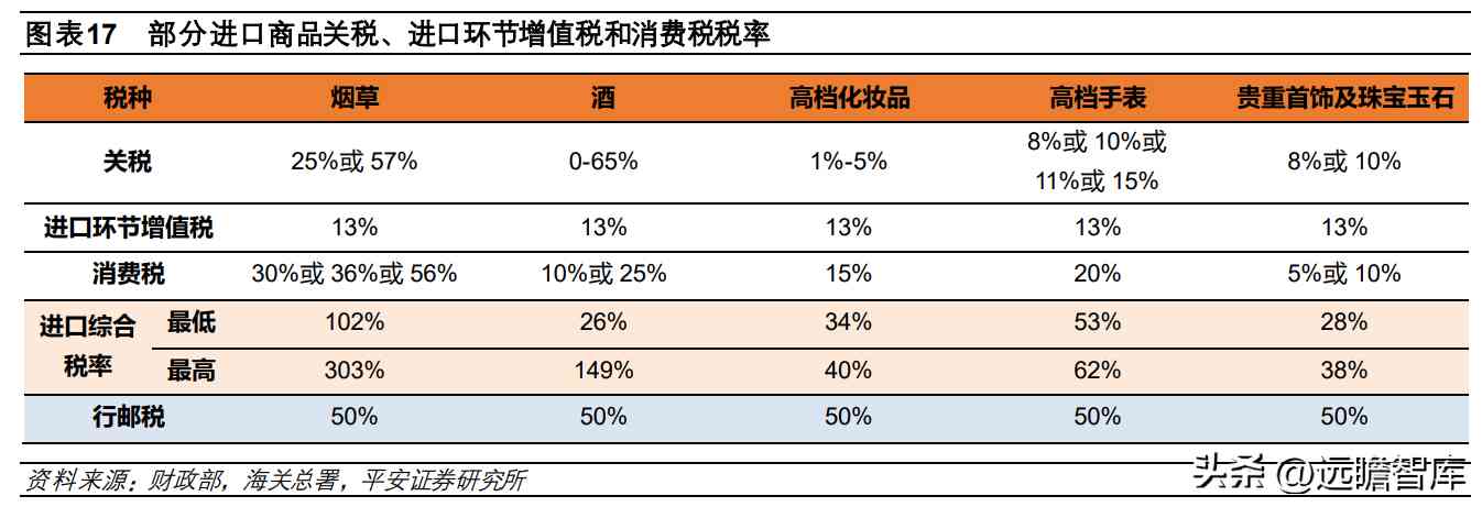 以同样的方式测算,烟草、酒、高档化妆品(进口完税价格 10元/ml(g)或 15元/片(张)及以上)、高档手表(单价 1万元以上)、贵重首饰及珠宝玉石免征的进口环节的综合税率最少约为 25%,最高可达约 300%。