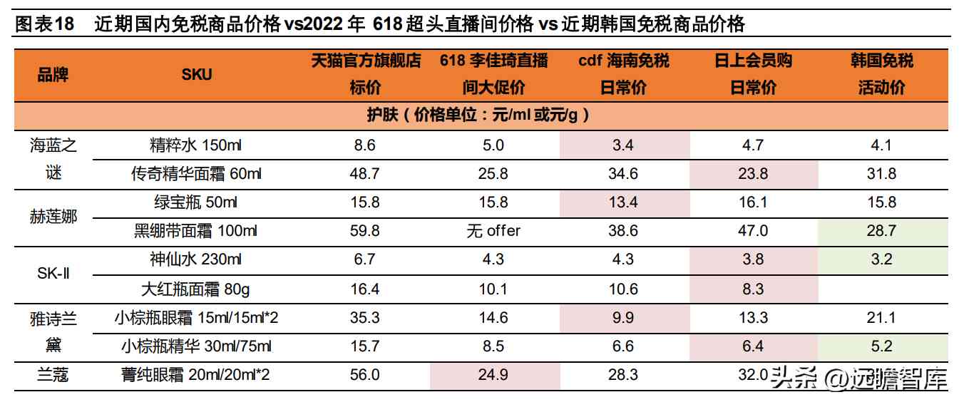 以化妆品为例,对比近期的免税店日常价格与超头直播间 618价格(通常为上半年的全网最低价),部分国际大牌明星单品免税店的日常价格与 618超头直播间价格打平或更低。