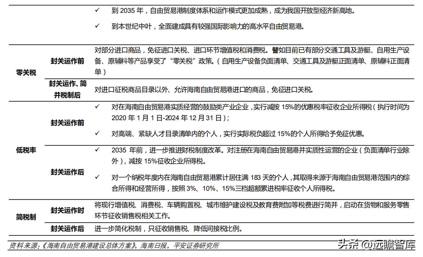 《总体方案》提出海南自贸港建设的分阶段目标,即 2025 前海南适时启动全岛封关运作,到 2035 年成为我国开放型经济新高地,到本世纪中叶全面建成具有较强国际影响力的高水平自由贸易港。