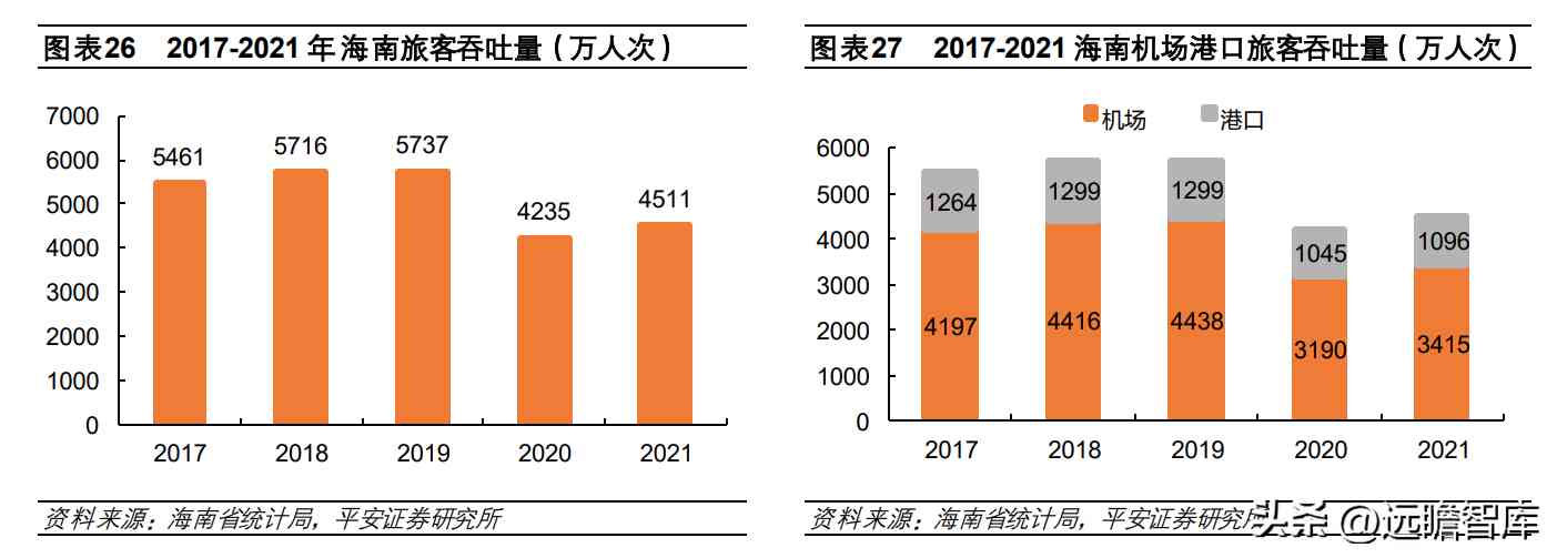 三亚凤凰机场、海口美兰机场以及海口新海港承担近 90% 出入海南岛的客流,根据海南省统计局等官方数据,2021年海南旅客吞吐量共 4511万人次,其中海口美兰机场、三亚凤凰 机场运输旅客量为 1752万人次、1663万人次,海口新海港进出港旅客量 661万人次,合计占比海南旅客吞吐量的 90%。