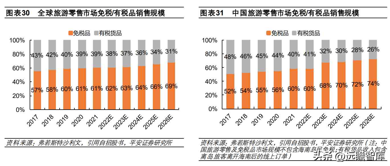 免税品在全球及中国旅游零售市场中占比约为 60%。