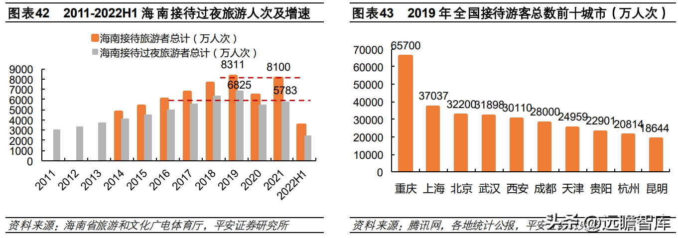 三亚、海口是海南接待旅客量最多的两大城市,2021 年三亚市、海口市分别接待过夜游客人数 2162 万人次、1685 万人次,占比海南过夜旅客总数的近 67%。