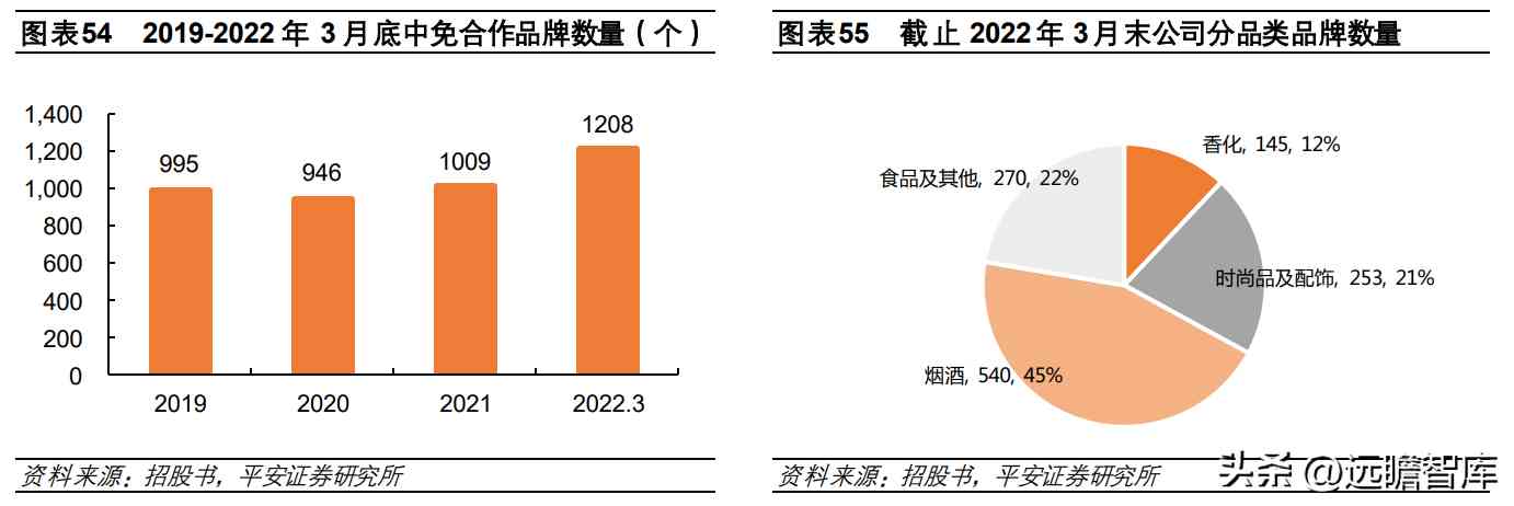截止 2019 年、2020 年、2021 年底及 2022 年 3 月末,公司合作品牌分别为 995 个、946 个、1009 个和 1208 个,分布于烟酒、时尚品、香化、食品等品类,包括雅诗兰黛、兰 蔻、卡地亚、爱马仕等一线国际大牌,以及 Thom Browne、Golden Goose等高潜力小众潮牌,品牌组合在国内所有免税运营商中最为全面。