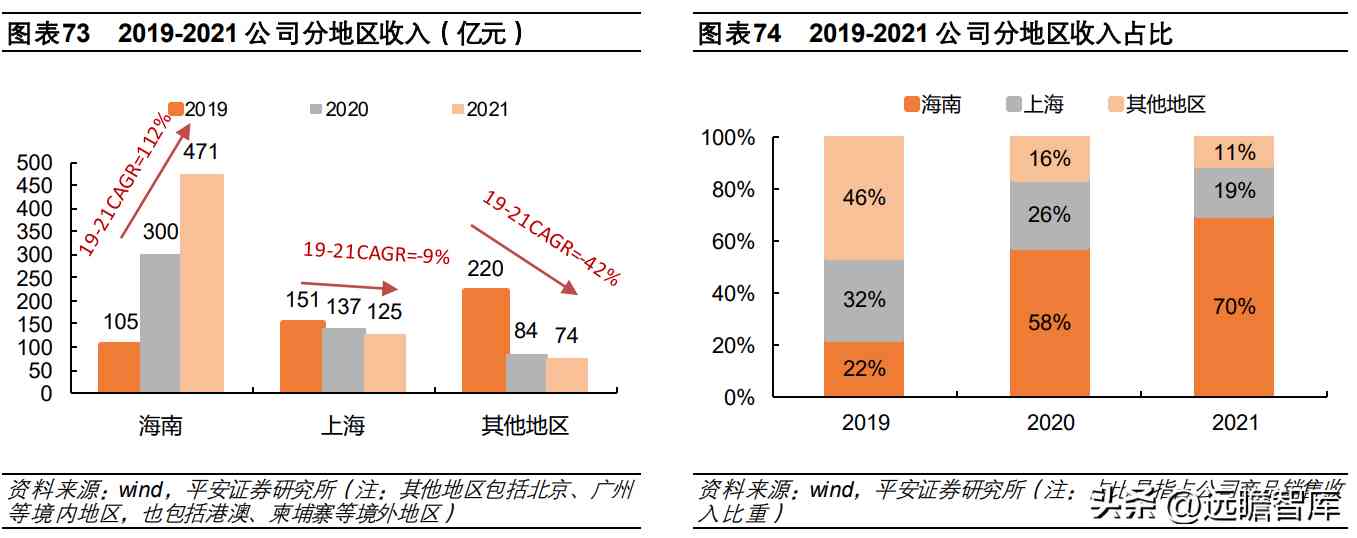 2021年公司海南、上海及其他地区收入分别为 471亿元、125亿 元、74 亿元,2019-2021 年复合增长率分别为 112%、-9%、-42%。海南业务为主要增长驱动,上海地区在线上会员购的支撑下降幅较小。2021年海南地区收入占比提升到了 70%,上海地区收入占比降至 19%。