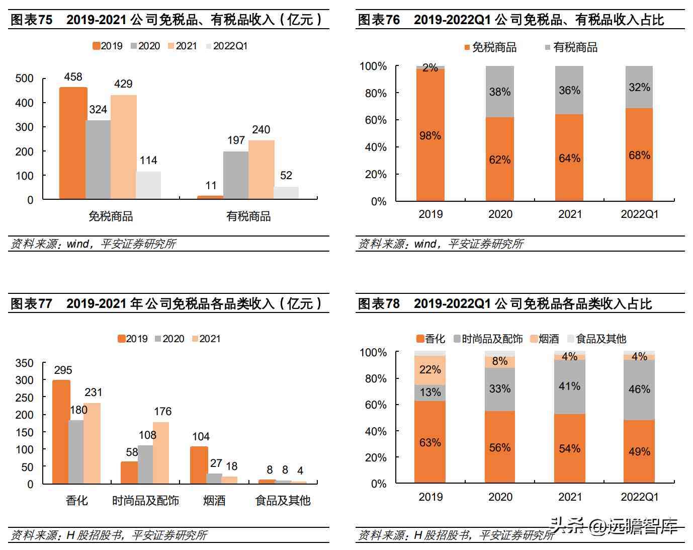2019-2021 年免税品收入中,香化产品收入分别达到 295 亿元、180 亿元、231 亿元,占免税品收入的 63%、56%、54%,考虑有税(2019-2021 年有税品收入中香化占比均超过 90%)香化产品收入总计约达 295 亿元、367 亿元、452 亿元,占比 62%、70%、68%,维持高位。