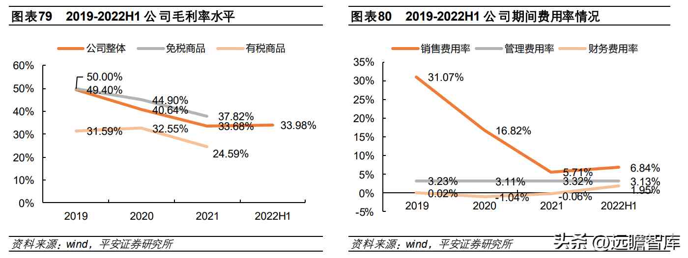 2019-2021 年公司毛利率从 49.40%下降至 33.68%,主要系低毛利率的有税商品销售增长以及折扣促销所致。其中,免税商品毛利率从 50.00%下降至 37.82%,有税商品毛利率从 31.59%下降至 24.59%。