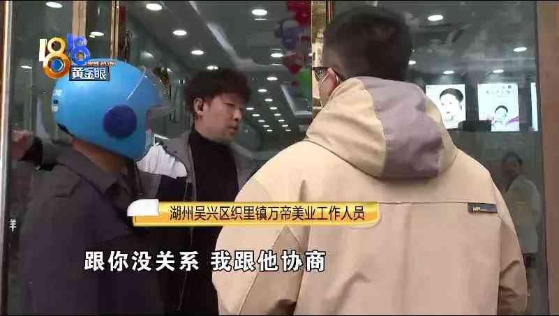 湖州吴兴区织里镇万帝美业工作人员:“他可以进来,你不可以接受(但我们想跟他协商一下)跟你没关系,我跟他协商(跟我们当然有关系)你(小李)要协商你就进来(我们有监督和报道的责任)跟我没有关系,我完全可以不接受你的采访(那你能代表店里面不接受采访吗?)不可以(不可以那你应该有能代表店里的人)我只能告诉你不可以(你要有能代表店里的人拒绝)我不跟你讲话,停(您是这里的法人(代表)吗?)(小李的父亲:他不是的)(那您是店长吗?)(小李的父亲:店长在那里坐着)(我们肯定要听一下你们双方的情况,是不是)他自己很清楚(你们价目表有没有出示给他看过?他说没有,你们有没有给他看过)(小李的父亲:你们做之前,你跟他说多少钱了没有?)你可以问他不可以问(这是我们的工作)你要出去就出去(小李的父亲:我要跟记者讲话的)(小李的父亲:你钱都收了,还怕影响你关门啊)(别着急,这样子,你是要跟他们单独)(小李的母亲:这个是店长)(店长你好,店长?)(路人:可以洗头吗)可以可以(你们要不要跟他单独协商?)我们已经在协商,而且通过市场监管局、公安局都在协商,所有的东西他都是自愿的,而且我最知道你们会断章取义的(我们断章取什么义?)这种看多了(那好,既然看多了,首先价目表有没有向他出示?)跟你没关系。”