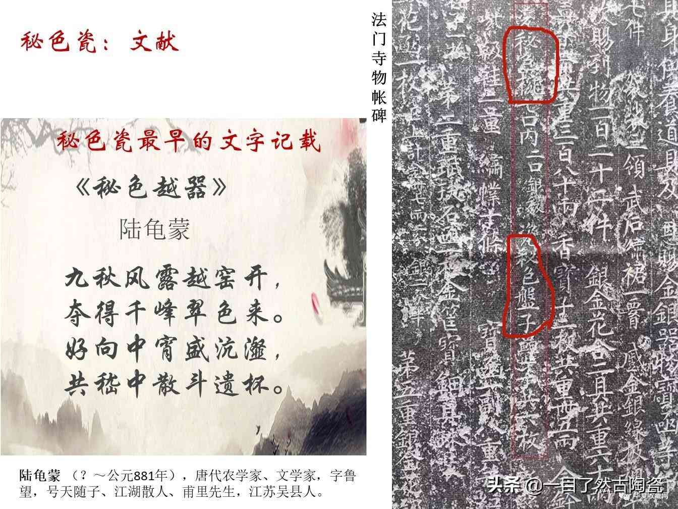 (1)“秘色瓷”的说法最早出自晚唐诗人陆龟蒙诗篇《秘色越器》中。只有文献还不足以确定秘色瓷的存在。故宫瓷器考古专家陈万里先生曾多次到浙江等地寻找另两个要素:秘色瓷窑址和实物瓷片。
