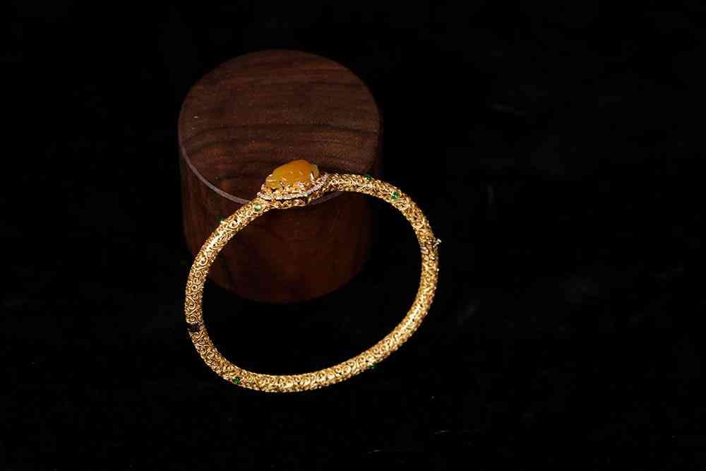 18K金镂空卷草纹,开口手镯,一枚金包银籽料螃蟹点缀其上,活灵活现,亦承八方来财之美意。
