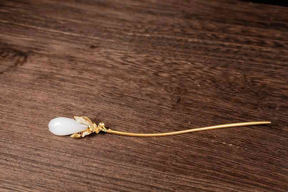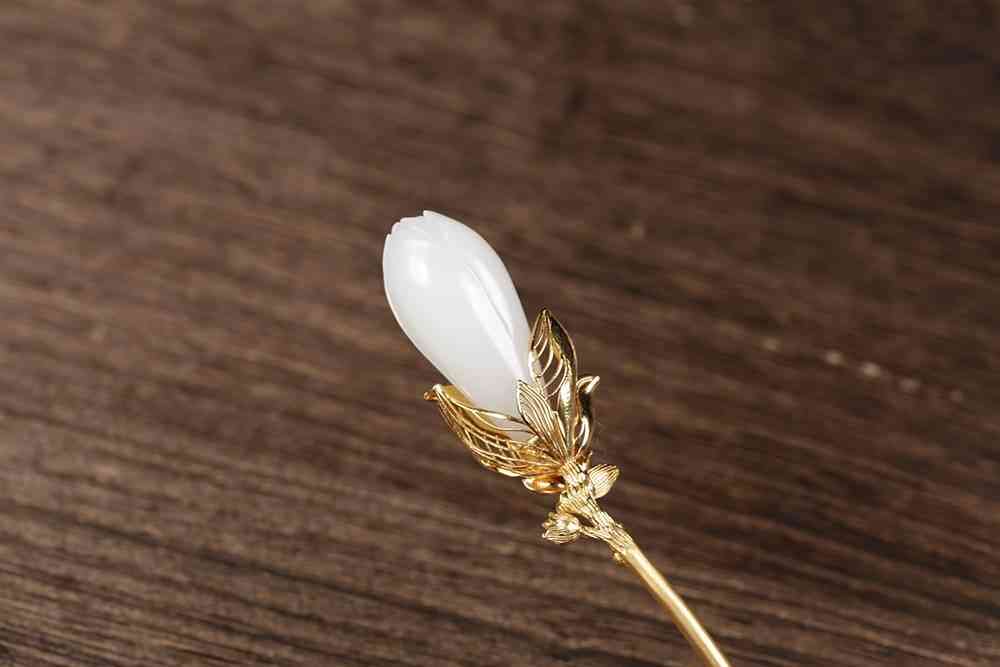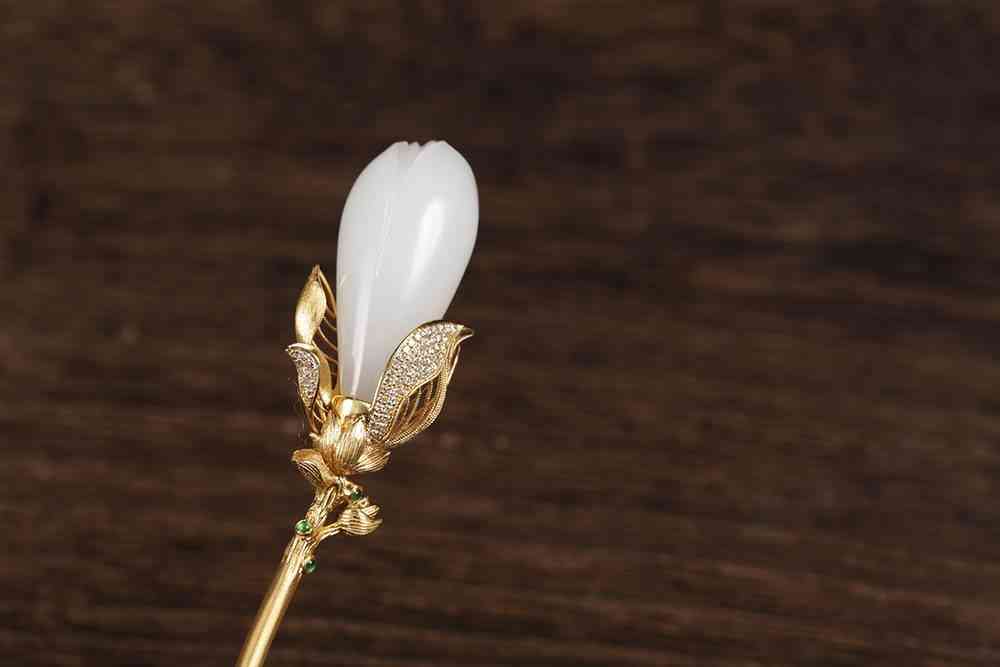 是谓“若非月姊黄金钏,难买天孙白玉簪”,以白玉籽料巧琢玉兰花苞,造型饱满,栩栩如生,黄金做金枝,素雅与轻奢,很是相衬。