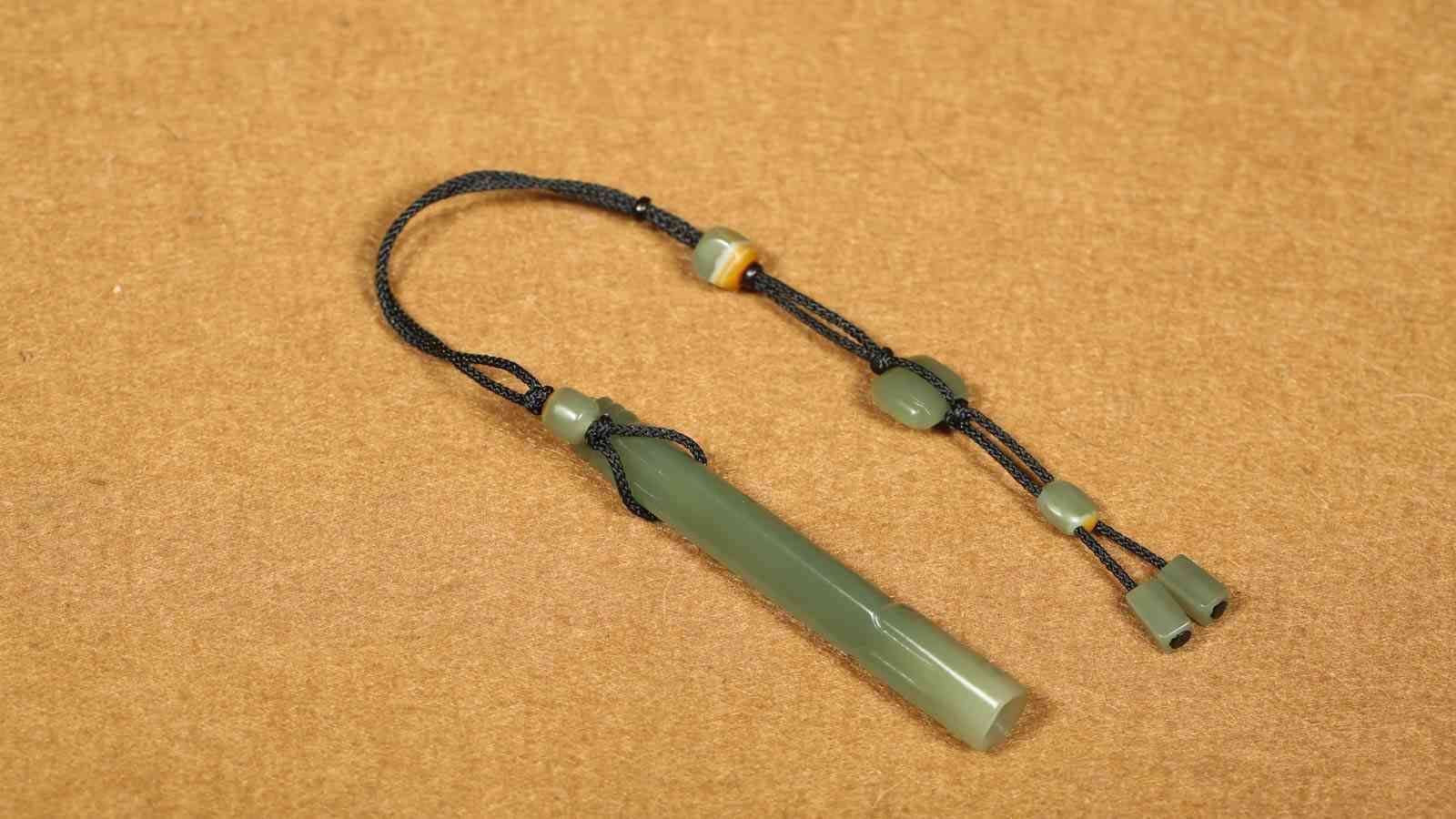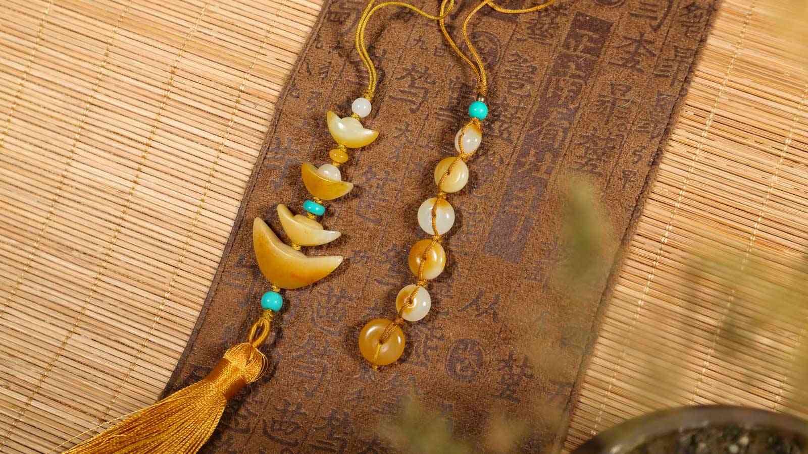玉作小坠常有,然以精品独籽巧琢的小坠难寻,此两条皆以上乘独籽为材,四枚元宝、六颗平安扣,以呈平安吉祥之寓意,玉色相近,玉质凝润,可做包挂,点缀于日常衣着之上,别有意韵。