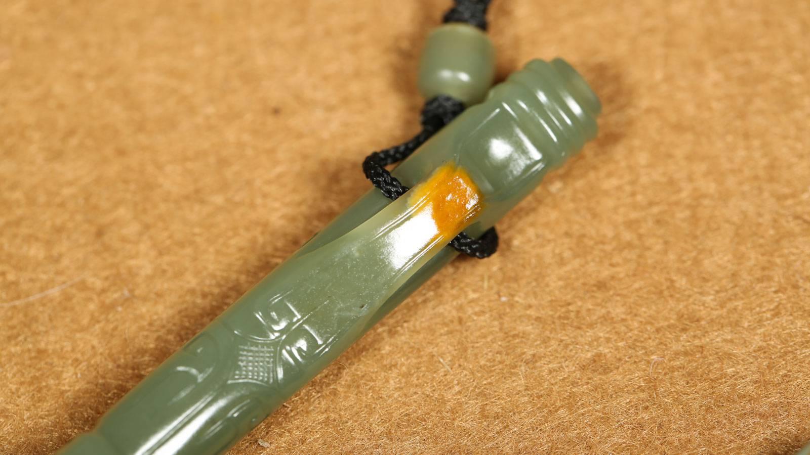 市面上比较少见的和田玉实用器,以上乘河磨料为材,玉质油糯,玉色舒服,局部留皮,同料配珠,仿古设计,老味十足,其设计粗细适当,兼具实用性与观赏性。