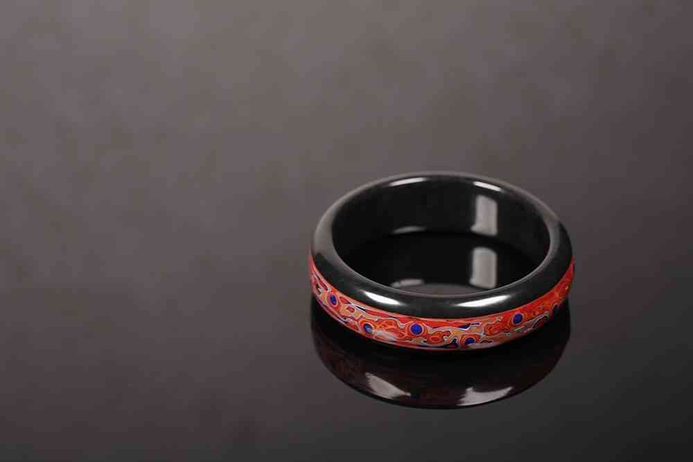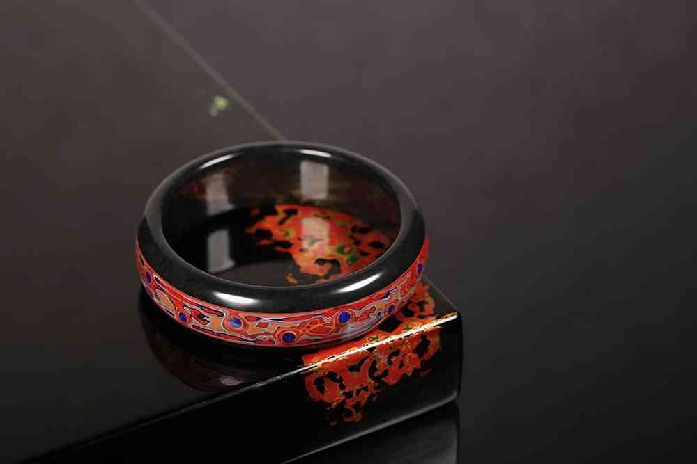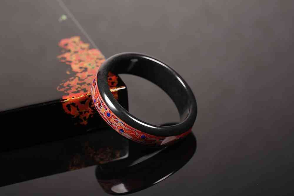 漆艺与凝玉的结合,很有个性,选上乘新疆和田墨玉籽料为材,中间开槽,施以漆艺,层层叠叠,泛起随机的涟漪感,红漆黑玉,是件不可复刻的孤品。