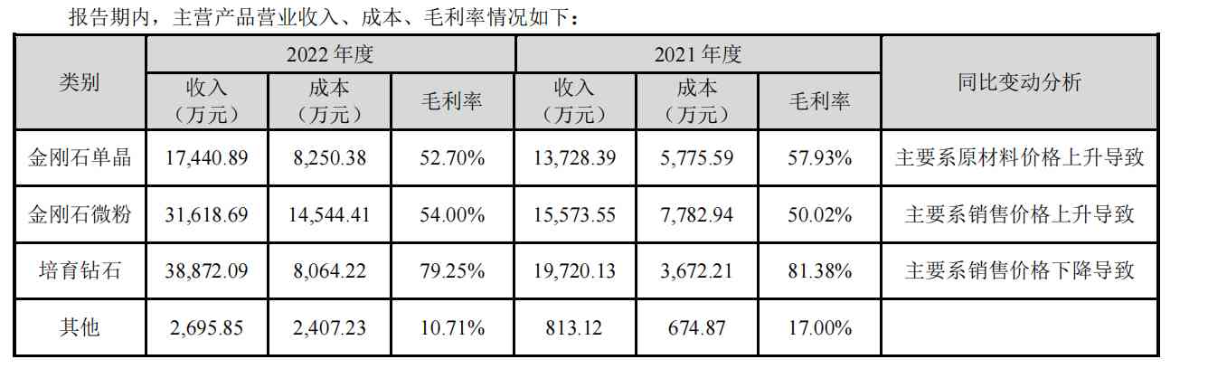 其中,培育钻石已经成长为公司的大业务。从营业收入构成上看,培育钻石占营收比例达42.89%;金刚石微粉成为主营业务中,营收增幅增长最大的板块,同比上涨103.03%。