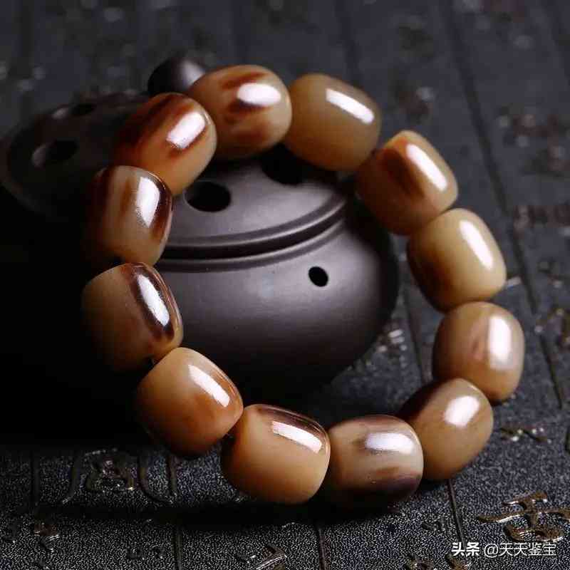 色黄黑相间,表面光亮,无横纹有纵纹,很坚韧。牦牛角手串上手温润不凉,手感非常细腻,盘玩佩戴时让人爱不释手。