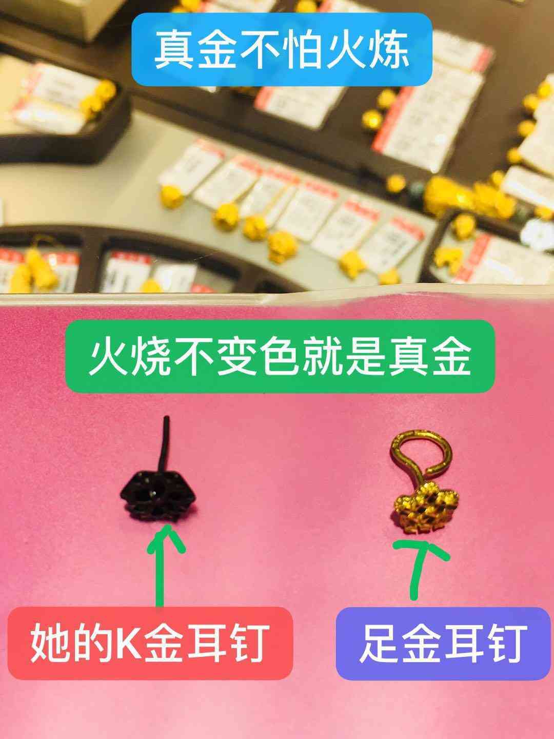 并且真金不怕火炼,K金被火烧后就会变黑,大家可以用煤气灶的火焰烧一下试一下,K金被烧后会变色,还不好弄回来,大家最好还是不要试了,颜色变了弄不回来就惨了。[流泪][流泪][流泪]