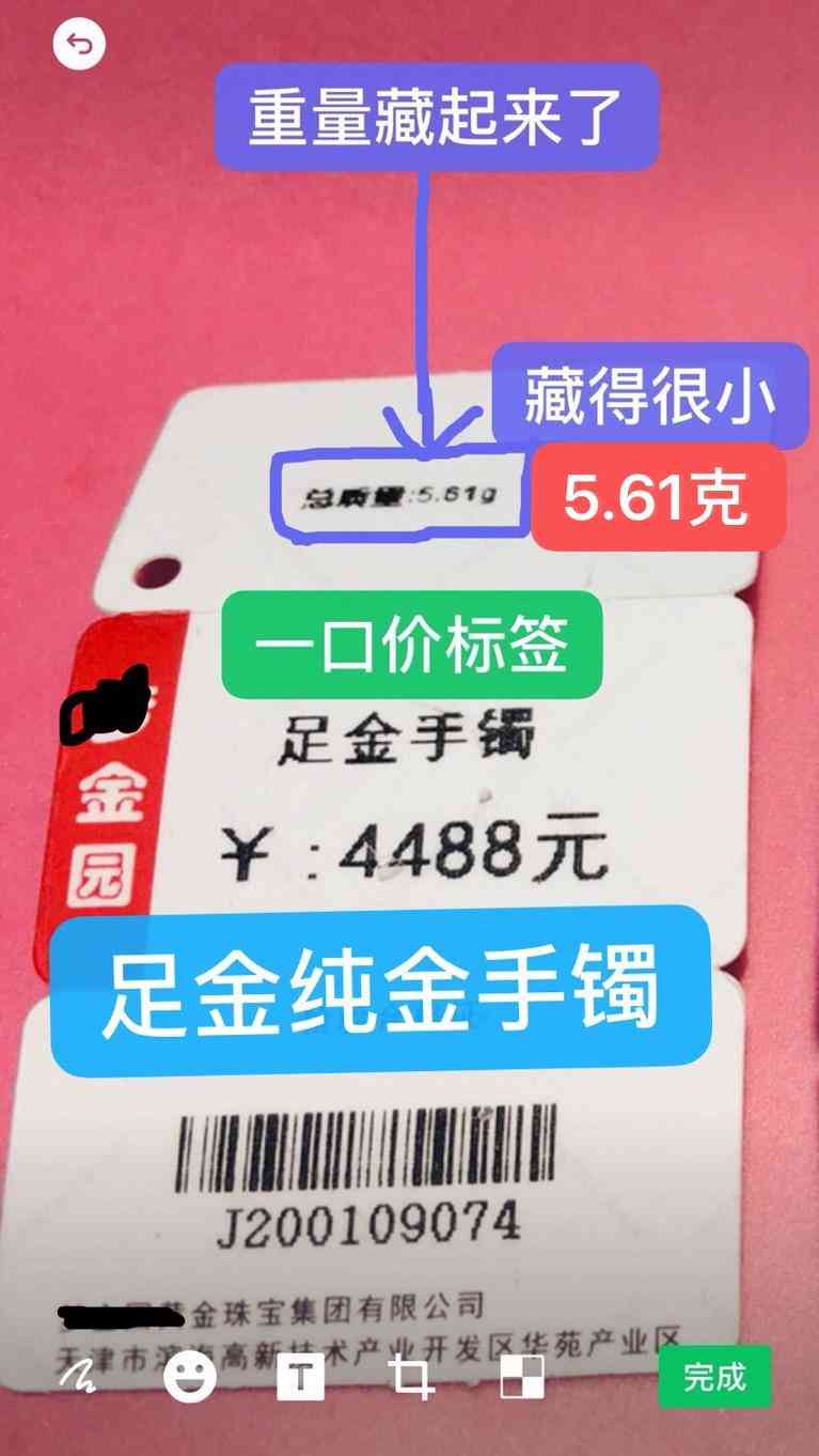 标签是不能乱写的,上面的信息就是黄金饰品的基本信息,如果商家乱写标签,我们就可以参照《消费者权益保护法》进行索赔,比如所明明是K金(Au750和Au916),标签上确是标的足金,质保单也是足金的,那商家就要被罚假一罚1赔3。但是如果商家给你说的是足金,但是卖给你的却是金Au916或金Au750,那你就上当受骗了。[衰][衰][衰]