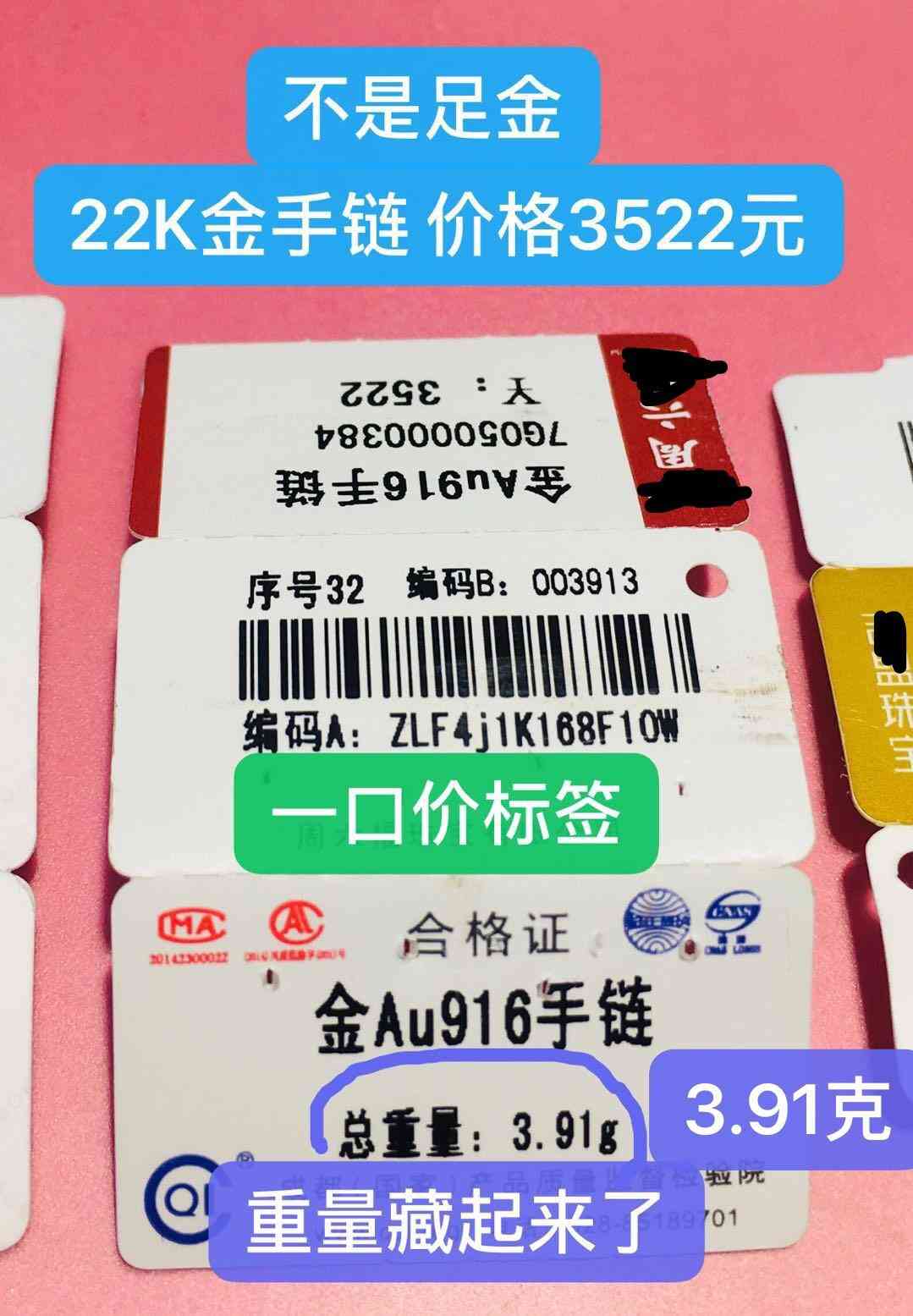 金Au916的22K手链,重量3.91克,价格3522元,编号A和编号B应该是质监局网站的查询码,可以当二维码看待;3522元除以3.91克=900元/克。而这种22K金的回收价格只有纯黄金的91.6%,这个手链是我的一个客户当纯金买的,亏了不少。