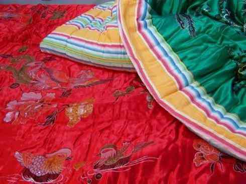红纱锦帐珠帘挑,半床烟花暖闺阁。最喜欢看她在阳光晴好的日子里,把结婚时候的被子一床一床的搭在房顶的绳子上——有时是象牙白的丝绸被面上绣着淡紫色的鸳鸯,配着雪白的洋布被里儿,仿佛窗含西陵千秋雪的样子,我常常想她就是那只门泊东吴的万里船;有时是火红的丝绸被面上泥金了夸张的龙凤呈祥,搭配满是小喜字的竖条纹被里儿,很有暖香惹梦鸳鸯锦的味道;尤其是一床紫罗兰的缎被,被面是丝绸的,上面满是丝线织就的金龙,逼人的帝王气象,而被里儿则是乡间常见的蜡染,甲骨文样的寿字密密麻麻,烟火气十足,两者搭配,真的是俗到了极致,也雅到了极致,一眼看去,先是惊愕,再是惊艳,洞房深处,几度欢散歌阑,香暖鸳鸯被,真个是万般千种,说不尽的相怜相惜。