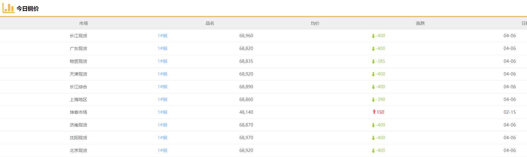 1#铜 | 北京 | 68920 | -400 |
