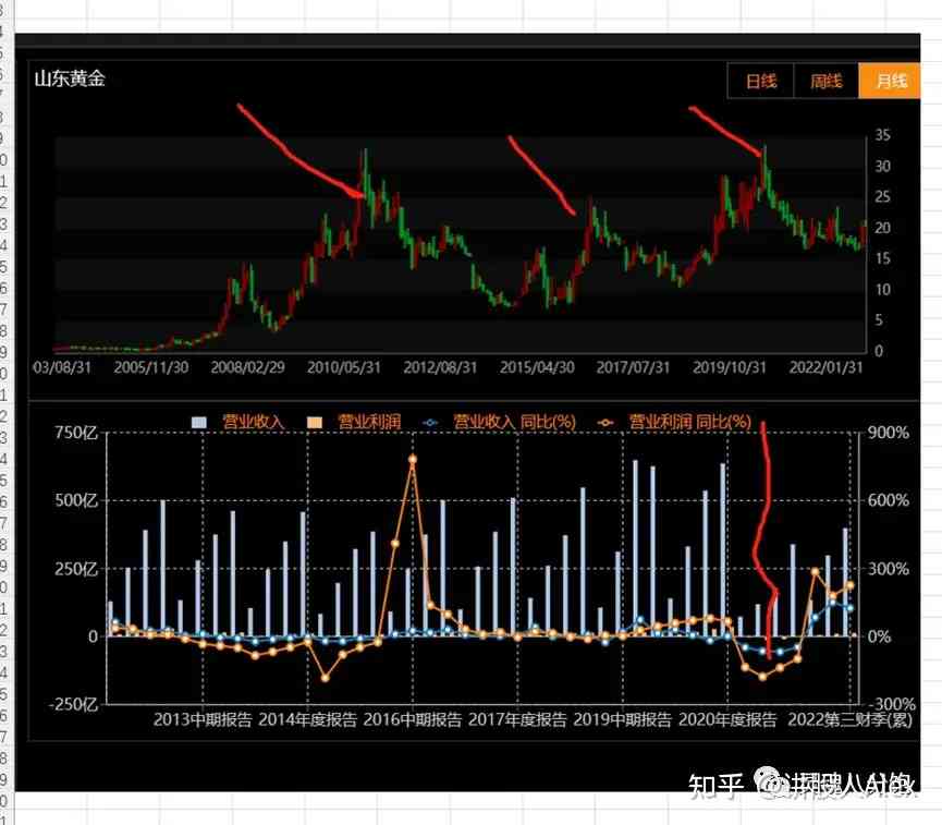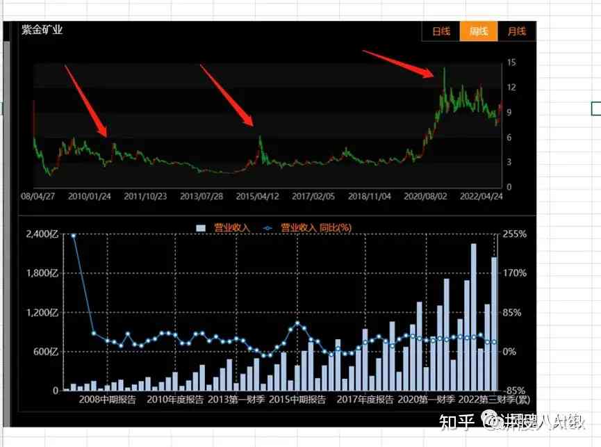 我们看看山东黄金这支20年40倍公司。(很可笑的是,如果你持有他,在2010-2020年的10年,你几乎是不赚钱的)。他在2010年,2016年,2019(主要是俄乌战争,不是需求周期)出现了几次股价的高位。头2次,都是美国开始剧烈加息。然后中国开始应对放水减息。这个和我们理解的有一些不一样,因为美联储加息,其实黄金是跌的。为什么那时候开始涨呢,一个是股票的提前性。一个是中国放水对本国黄金的需求。那么今天2023年,历史有一次上影,5年一个经济周期是重现的。美国开始加息,会逐步在高位开始降息。然后中国明年要开始刺激经济也只有放水这套。因此大宗的避险需求会明确。 2019年那波,紫金矿业也是这个逻辑,我们看紫金矿业的股票也是也有这个明显的周期特点 :