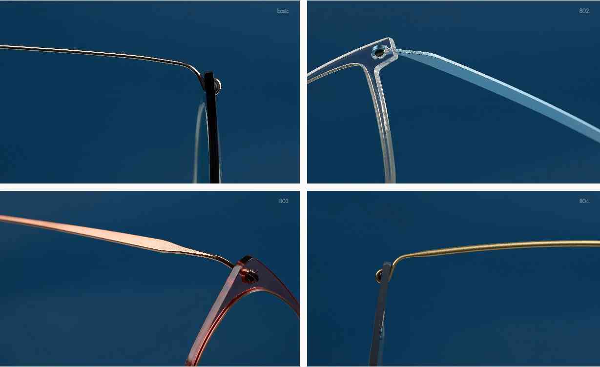 镜腿是无框眼镜重要的特征之一,包括三种截然不同的镜腿设计:优雅的钛丝、富于表现力的钛板到彩色纤维板材, 所有的镜腿均不使用螺钉固定,构成了一套完整的 “订制系统”。Spirit系列的镜腿款式、颜色和尺寸提供了众多选择。