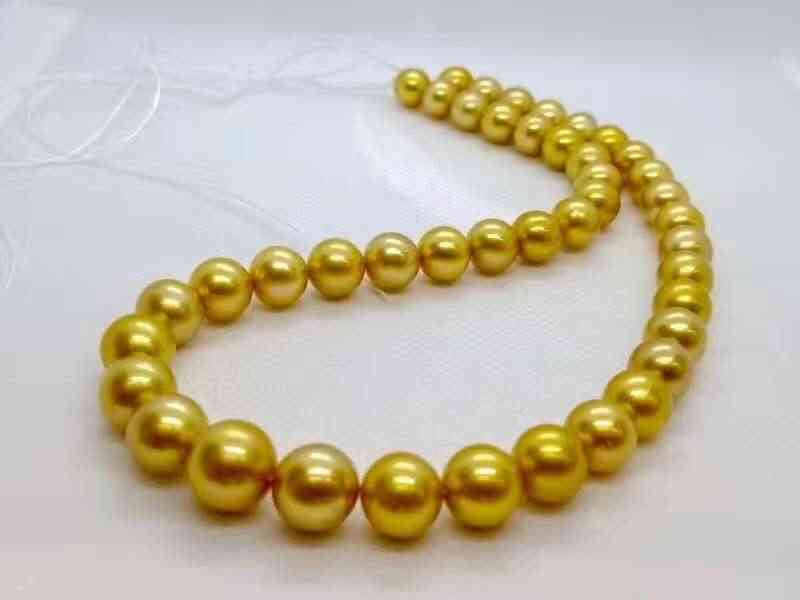 我最喜欢南洋金珠。虽然珍珠行家都会要圆度,通透,光泽,瑕疵度来判定珠子的价值,但是我觉得除非达到收藏级别,一般我只在乎珠子的可塑性及特别的色调。说真的,再完美的珠子都是要打孔镶托,除非裸珠收藏,否则不用太执着。图上那一条基本是超级棒的无染色茶金色,颜色浓的化不开,这可以当做收藏品,几万块,土豪才能买的起了,哈哈。