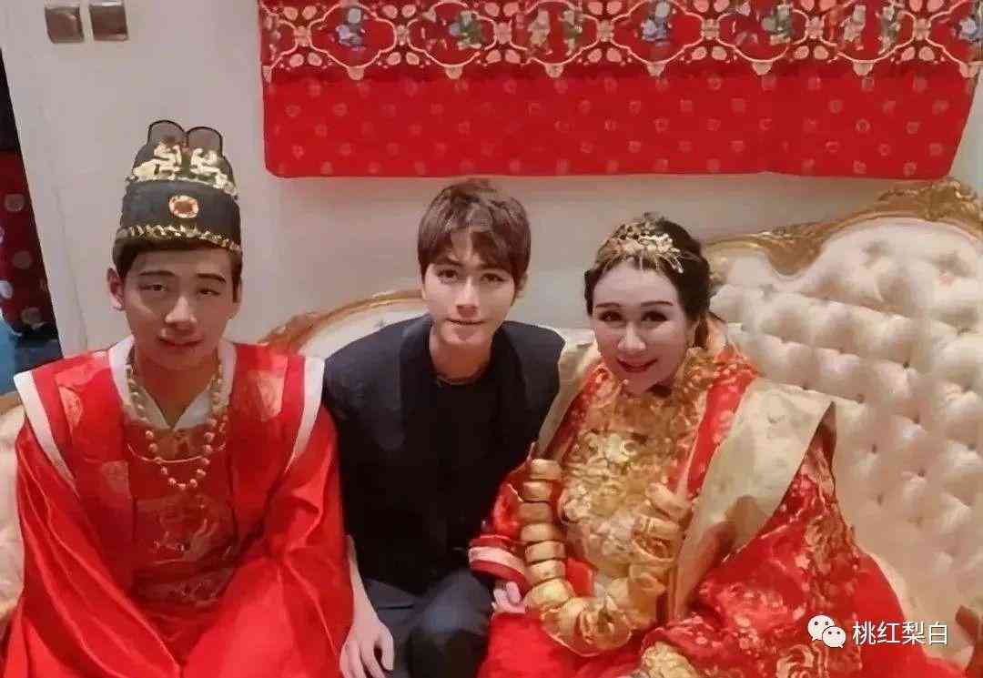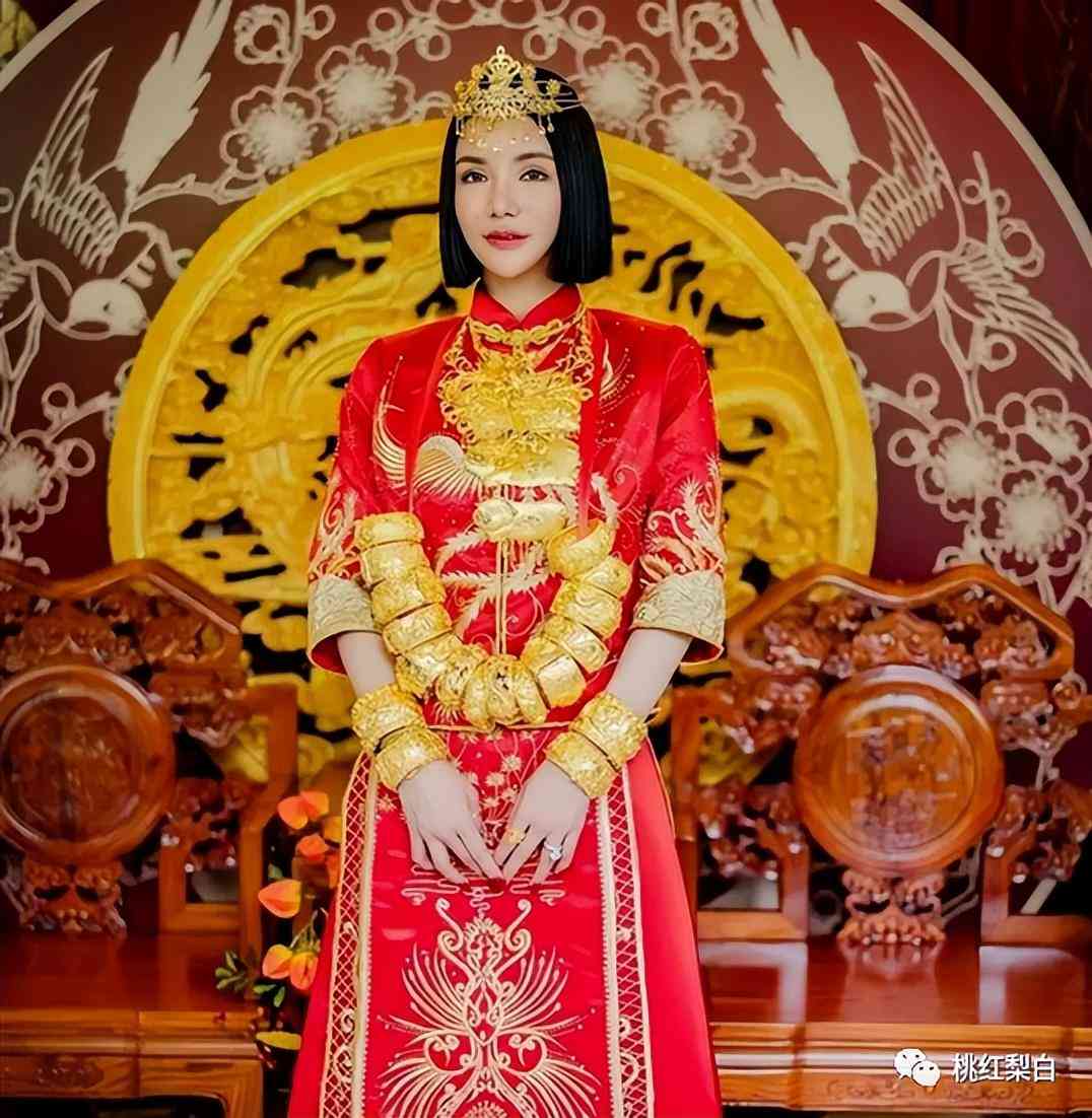 结婚时,林慧俐身挂18只黄金手镯,胸前戴金猪牌,头顶黄金头饰,举手投足间尽展百亿千金气势。