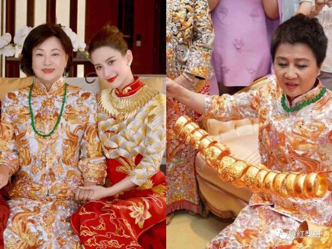 更别说站C位的何超盈宛如人形发财树,金猪、金项链、龙凤镯挂了满身,视觉效果不是一般的震撼!