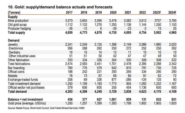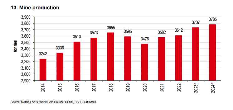 金矿开采面临的真正挑战可能在2025年之后,随着新项目数量下降,新生产将越来越不足以抵消矿石品位下降和储量枯竭,汇丰将2023年的预测从3757吨削减至3737吨,并将2024年的产量预测从3800吨下调至3785吨。