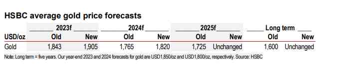 将2023年和2024年的平均价格预测分别从1843、1765美元/盎司上调至1905、1820美元/盎司。