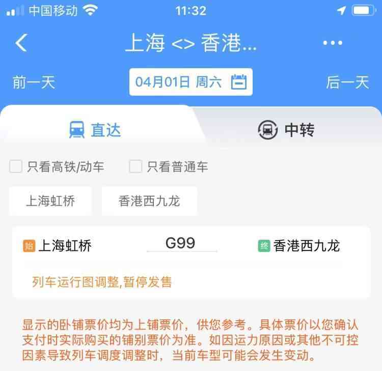 记者今天在12306客户端查询,4月1日上海虹桥至香港西九龙暂时显示“暂停发售”。